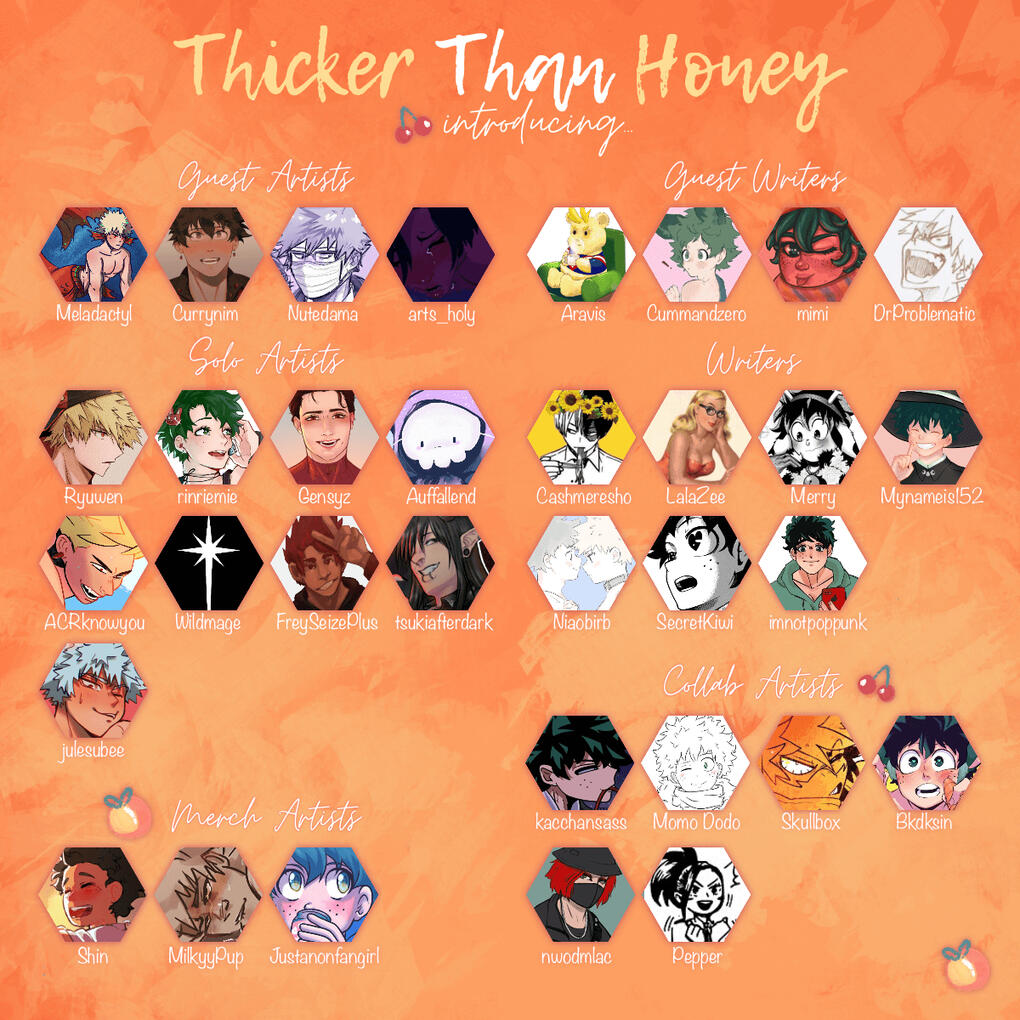 Welcome! We are Thicker Than Honey, an NSFW for-profit bakudeku/dekubaku zine centred around appreciating Midoriya's ass and Katsuki's chest! This zine is officially complete, and we're ever grateful to all the fantastic people who helped run, support, and contribute to the zine.